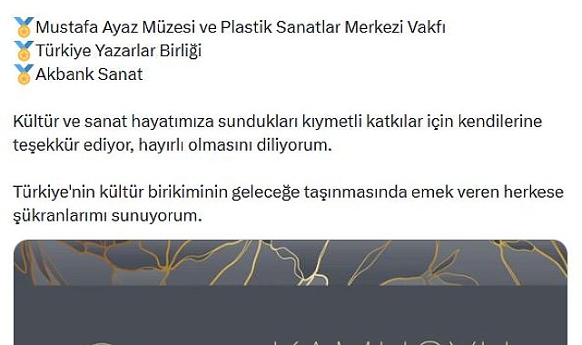 KÜLTÜR ve Turizm Bakanlığı Özel Ödülleri'nin 2025 yılı sahipleri belli oldu. Mustafa Ayaz Müzesi ve Plastik Sanatlar Merkezi Vakfı, Türkiye Yazarlar Birliği ve Akbank Sanat, 2025 yılı Özel Ödülleri'nin sahipleri oldu.Bakanlıktan yapılan açıklamaya göre; Türkiye'nin kültür ve sanat hayatına uzun yıllardır yön veren Kültür ve Turizm Bakanlığı Özel Ödülleri'nin 2025 yılı sahipleri belli oldu. Kültür ve Turizm Bakan Yardımcıları Batuhan Mumcu ve Nadir Alpaslan başkanlığında düzenlenen değerlendirme toplantısı; Güzel Sanatlar Genel Müdürü Ömer Faruk Belviranlı, Devlet Tiyatroları Genel Müdürü Tamer Karadağlı, Devlet Opera ve Balesi Genel Müdürü Bedri Tan Sağtürk, Yaşayan Miras ve Kültürel Etkinlikler Genel Müdürü Selim Terzi ve Ankara Müzik ve Güzel Sanatlar Üniversitesi Rektörü Prof. Dr. Erhan Özden'in katılımıyla 18 Kasım'da gerçekleştirildi. 2025 yılı Kültür ve Turizm Bakanlığı Özel Ödülleri, Türkiye'nin kültür ve sanatını ulusal ve uluslararası düzeyde temsil eden kurumların uzun soluklu çalışmalarına duyulan takdirin bir göstergesi olarak veriliyor. ÖZEL ÖDÜLLERİN YENİ SAHİPLERİÖdüle layık görülen Mustafa Ayaz Müzesi ve Plastik Sanatlar Merkezi Vakfı, merhum ressam Mustafa Ayaz'ın kişisel sanatsal birikimini özgün bir müze yapısıyla bütüncül şekilde gelecek kuşaklara aktarması, Ankara'nın kültür ve sanat yaşamındaki konumu, çok yönlü sergi ve eğitim faaliyetleriyle sanatsal üretime yön vermesi nedeniyle takdir edildi. Vakfın her yaştan sanatsevere sunduğu kurslar ve sanat eğitimi konusundaki öncü yaklaşımı, ödülün verilmesinde belirleyici oldu. Türkiye Yazarlar Birliği ise Türkiye'nin en geniş katılımlı yazar kuruluşu olarak edebiyat, düşünce ve sanat alanlarında yürüttüğü çalışmalar, 'Türkiye Kültür ve Sanat Yıllığı', 'Yazar Okulu', 'Türkçe'nin Uluslararası Şiir Şöleni' gibi süreklilik gösteren projeleri ve yayıncılık faaliyetleriyle edebiyat dünyasına yön veren kurumsal katkıları sebebiyle ödüle değer bulundu. Birliğin mesleki dayanışmayı güçlendiren yapısı, edebi üretimi destekleyen vizyonuyla öne çıktı. 2025 yılının bir diğer ödül sahibi de Akbank Sanat oldu. Kurum, sanatsal üretimi teşvik eden rolü nedeniyle ödüle layık görüldü. Akbank Sanat'ın kültürler arası diyaloğu güçlendiren nitelikli etkinlikleri de değerlendirmede etkili oldu.'KURUMLARIMIZI DESTEKLEMEKTEN MEMNUNİYET DUYUYORUZ'Kültür ve Turizm Bakanı Mehmet Nuri Ersoy, ödüle layık görülen kurumları sosyal medya hesabından açıkladı. Türkiye'nin kültür ve sanatını güçlendiren, üretimi ve yaratıcılığı her geçen yıl daha ileriye taşıyan kurumları desteklemekten büyük memnuniyet duyduklarını dile getiren Ersoy, "Kültür ve Turizm Bakanlığımızın 2025 yılı Özel Ödülleri'nin sahipleri belli oldu. Ülkemizin kültür ve sanatını güçlendiren, üretimi ve yaratıcılığı her geçen yıl daha ileriye taşıyan kurumlarımızı desteklemekten büyük bir memnuniyet duyuyoruz. Mustafa Ayaz Müzesi ve Plastik Sanatlar Merkezi Vakfı, Türkiye Yazarlar Birliği, Akbank Sanat; kültür ve sanat hayatımıza sundukları kıymetli katkılar için kendilerine teşekkür ediyor, hayırlı olmasını diliyorum. Türkiye'nin kültür birikiminin geleceğe taşınmasında emek veren herkese şükranlarımı sunuyorum" dedi.