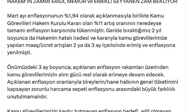 ANKARA, (DHA)- MEMUR Sendikaları Konfederasyonu (Memur-Sen) Genel Başkanı Ali Yalçın, Türkiye İstatistik Kurumu'nun (TÜİK) açıkladığı mart ayı enflasyon verilerine ilişkin, "Hakem'in zammı eridi, memur ve emekli seyyanen zam bekliyor" dedi
