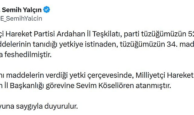 MHP Genel Başkan Yardımcısı Semih Yalçın, partisinin Ardahan İl Teşkilatı'nın feshedildiğini, il başkanlığı görevine Sevim Köseliören'in atandığını duyurdu.MHP'li Yalçın, sanal medya hesabından yaptığı açıklamada, "Milliyetçi Hareket Partisi Ardahan İl Teşkilatı, parti tüzüğümüzün 52'nci ve 54'üncü maddelerinin tanıdığı yetkiye istinaden, tüzüğümüzün 34'üncü maddesi uyarınca feshedilmiştir. Yine aynı maddelerin verdiği yetki çerçevesinde, Milliyetçi Hareket Partisi Ardahan İl Başkanlığı görevine Sevim Köseliören atanmıştır" dedi.