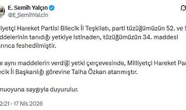 MHP Genel Başkan Yardımcısı Semih Yalçın, partinin Bilecik İl Teşkilatı'nın feshedildiğini, İl Başkanlığı görevine Talha Özkan'ın atandığını açıkladı.MHP'li Semih Yalçın, sanal medya hesabından yaptığı açıklamada, "Milliyetçi Hareket Partisi Bilecik İl Teşkilatı, parti tüzüğümüzün 52 ve 54'üncü maddelerinin tanıdığı yetkiye istinaden, tüzüğümüzün 34'üncü maddesi uyarınca feshedilmiştir. Yine aynı maddelerin verdiği yetki çerçevesinde, Milliyetçi Hareket Partisi Bilecik İl Başkanlığı görevine Talha Özkan atanmıştır" ifadelerini kullandı.