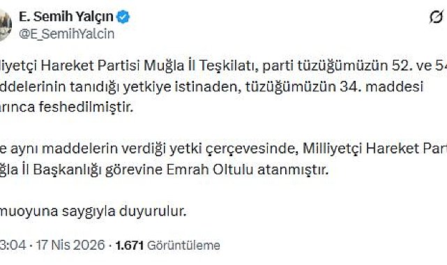 ANKARA, (DHA)- MHP Genel Başkan Yardımcısı Semih Yalçın, Muğla İl Teşkilatı'nın feshedildiğini, İl Başkanlığı görevine Emrah Oltulu'nun atandığını açıkladı