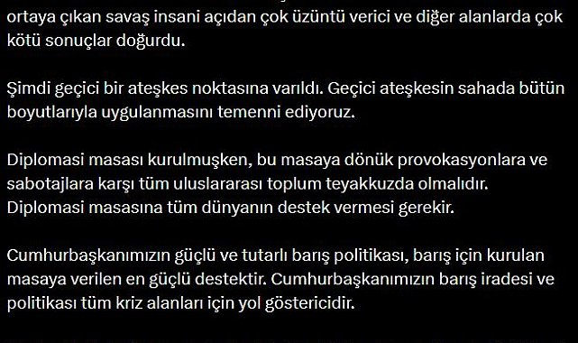 AK Parti Genel Başkan Yardımcısı ve Parti Sözcüsü Ömer Çelik, "Geçici ateşkesin sahada bütün boyutlarıyla uygulanmasını temenni ediyoruz. Diplomasi masası kurulmuşken, bu masaya dönük provokasyonlara ve sabotajlara karşı tüm uluslararası toplum teyakkuzda olmalıdır" dedi. AK Parti Sözcüsü Ömer Çelik, sanal medya hesabından yaptığı açıklamada, "ABD ve İsrail'in haksız ve hukuksuz şekilde İran'a saldırısı sonucunda ortaya çıkan savaş, insani açıdan çok üzüntü verici ve diğer alanlarda çok kötü sonuçlar doğurdu. Şimdi geçici bir ateşkes noktasına varıldı. Geçici ateşkesin sahada bütün boyutlarıyla uygulanmasını temenni ediyoruz. Diplomasi masası kurulmuşken, bu masaya dönük provokasyonlara ve sabotajlara karşı tüm uluslararası toplum teyakkuzda olmalıdır. Diplomasi masasına tüm dünyanın destek vermesi gerekir. Cumhurbaşkanımızın güçlü ve tutarlı barış politikası, barış için kurulan masaya verilen en güçlü destektir. Cumhurbaşkanımızın barış iradesi ve politikası, tüm kriz alanları için yol göstericidir. Kardeş Pakistan'a barış çabaları için teşekkür ediyoruz. Kardeş Pakistan'ı selamlıyoruz" dedi.