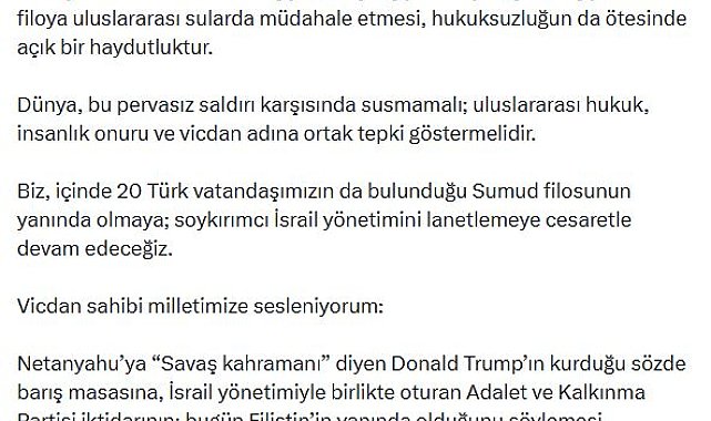 CHP Genel Başkanı Özgür Özel, "Gazze'ye yardım ulaştırmak için yola çıkan Küresel Sumud filosu, insanlığın ortak vicdanını temsil etmektedir. İsrail yönetiminin; ekmek taşıyan, ilaç taşıyan, dayanışma taşıyan bu filoya uluslararası sularda müdahale etmesi, hukuksuzluğun da ötesinde açık bir haydutluktur" dedi.CHP Genel Başkanı Özgür Özel, İsrail'in Küresel Sumud filosuna uluslararası sularda gerçekleştirdiği müdahaleye ilişkin sanal medya hesabından açıklama yaptı. Özel, "Gazze'ye yardım ulaştırmak için yola çıkan Küresel Sumud filosu, insanlığın ortak vicdanını temsil etmektedir. İsrail yönetiminin; ekmek taşıyan, ilaç taşıyan, dayanışma taşıyan bu filoya uluslararası sularda müdahale etmesi, hukuksuzluğun da ötesinde açık bir haydutluktur. Dünya, bu pervasız saldırı karşısında susmamalı; uluslararası hukuk, insanlık onuru ve vicdan adına ortak tepki göstermelidir. Biz, içinde 20 Türk vatandaşımızın da bulunduğu Sumud filosunun yanında olmaya; soykırımcı İsrail yönetimini lanetlemeye cesaretle devam edeceğiz. Vicdan sahibi milletimize sesleniyorum. Netanyahu'ya 'Savaş kahramanı' diyen Donald Trump'ın kurduğu sözde barış masasına, İsrail yönetimiyle birlikte oturan Adalet ve Kalkınma Partisi iktidarının; bugün Filistin'in yanında olduğunu söylemesi riyakarlıktır, samimiyetsizliktir. Bu ikircikli tutumun artık inandırıcılığı kalmamıştır. Soykırımcılarla aynı masada oturmanın utancını kimse bu millete yaşatamaz" ifadelerini kullandı.