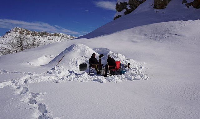 Şehir yaşamından uzaklaşıp dağda yaptığı kardan barınaklarda doğayla baş başa kalıyor