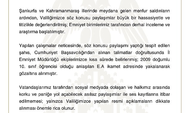 SİVAS'ta, sanal meydada kentteki okullara saldırı düzenleneceği yönünde paylaşım yaptığı belirlenen 10'uncu sınıf öğrencisi E.A. (17) gözaltına alındı. Şanlıurfa ve Kahramanmaraş'taki saldırılardan sonra bazı sosyal medya hesaplarında Sivas'taki okullara yönelik saldırı olacağına dair paylaşımlar yapıldığı iddiası üzerine Sivas Cumhuriyet Başsavcılığı çalışma başlattı. Yapılan çalışmada sanal medya platformunun sohbet kanalında 'Bufalo58' kullanıcı ismi ile 'Yarın Sivas'ta yeni bir haber duyacaksınız' paylaşımının sosyal medyada dolaşıma sokulduğu tespit edildi. İl Emniyet Müdürlüğü ekiplerinin çalışması sonrası paylaşımı yapan kullanıcının 10'uncu sınıf öğrencisi E.A. olduğu belirlendi. Şüpheli ikamet ettiği adreste gözaltına alındı. VALİLİKTEN AÇIKLAMASivas Valiliği konuyla alakalı resmi sanal medya hesabından basın açıklaması yaptı. Açıklamada, "15.04.2026 Çarşamba günü, bazı sosyal medya hesaplarında ilimizde okullara yönelik saldırı olabileceğine dair paylaşımlar yapıldığı tespit edilmiştir. Şanlıurfa ve Kahramanmaraş illerinde meydana gelen menfur saldırıların ardından, Valiliğimizce söz konusu paylaşımlar büyük bir hassasiyetle ve titizlikle değerlendirilmiş; Emniyet birimlerimiz tarafından derhal inceleme ve araştırma başlatılmıştır. Yapılan çalışmalar neticesinde, söz konusu paylaşımı yaptığı tespit edilen şahıs, Cumhuriyet Başsavcılığından alınan talimatlar doğrultusunda İl Emniyet Müdürlüğü ekiplerimizce kısa sürede belirlenmiş; 2009 doğumlu 10'uncu sınıf öğrencisi olduğu anlaşılan E.A. ikamet adresinde yakalanarak gözaltına alınmıştır. Vatandaşlarımız tarafından sosyal medyada dolaşan ve halkımız arasında korku ve paniğe yol açabilecek asılsız paylaşımlar ile ses kayıtlarına itibar edilmemesi; yalnızca Valiliğimizce yapılan resmi açıklamaların dikkate alınması önemle rica olunur. İlimizde huzur ve güven ortamının korunmasına yönelik olarak kolluk kuvvetlerimiz ve ilgili tüm birimlerimiz 7 gün 24 saat esasına göre teyakkuz halinde görevlerini sürdürmektedir" ifadelerine yer verildi.
