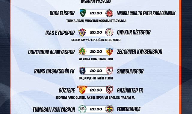 SÜPER Lig'de 33'üncü haftanın programı açıklandı. 33'üncü hafta karşılaşmaları 9 Mayıs Cumartesi günü saat 20.00'de oynanacak. Haftanın karşılaşmaları şöyle:9 MAYIS CUMARTESİ20.00 Natura Dünyası Gençlerbirliği - Kasımpaşa20.00 Kocaelispor - Mısırlı.com.tr Fatih Karagümrük20.00 ikas Eyüpspor - Çaykur Rizespor20.00 Corendon Alanyaspor - Zecorner Kayserispor20.00 RAMS Başakşehir - Samsunspor20.00 Göztepe - Gaziantep FK20.00 TÜMOSAN Konyaspor - Fenerbahçe20.00 Galatasaray - Hesap.com Antalyaspor20.00 Beşiktaş - Trabzonspor