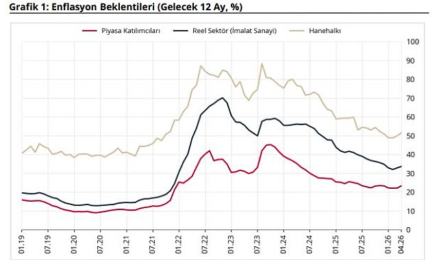 TÜRKİYE Cumhuriyet Merkez Bankası (TCMB), 12 ay sonrası yıllık tüketici enflasyonu beklentilerinin piyasa katılımcıları için 1,22, reel sektör için 0,80, hanehalkı içinse 1,67 puan arttığını açıkladı. TCMB, Nisan 2026 dönemine ilişkin sektörel enflasyon beklentilerini açıkladı. Buna göre; 12 ay sonrası yıllık enflasyon beklentileri bir önceki aya göre, piyasa katılımcıları için 1,22 puan artarak yüzde 23,39 seviyesine, reel sektör için 0,80 puan artarak yüzde 33,70 seviyesine, hanehalkı için 1,67 puan artarak yüzde 51,56 seviyesine yükseldi. Gelecek 12 aylık dönemde enflasyonun düşeceğini bekleyen hanehalkı oranı bir önceki aya göre 0,57 puan azalarak yüzde 14,57 seviyesinde gerçekleşti.