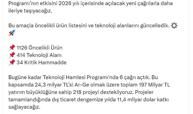 SANAYİ ve Teknoloji Bakanı Mehmet Fatih Kacır, Teknoloji Hamlesi Programı kapsamında öncelikli ürün listesinin ve teknoloji alanlarının güncellendiğini açıkladı.Bakan Kacır, sanal medya hesabından yaptığı açıklamada, "Ülkemizin katma değeri yüksek, yenilikçi ve rekabetçi üretim altyapısını güçlendirmek amacıyla hayata geçirdiğimiz Teknoloji Hamlesi Programı'nın etkisini, 2026 yılı içerisinde açılacak yeni çağrılarla daha ileriye taşıyacağız" dedi.Bu hedef doğrultusunda öncelikli ürün listesini ile teknoloji alanlarının güncellendiğini belirten Kacır, yeni dönemde 1126 öncelikli ürün, 414 teknoloji alanı ve 34 kritik ham maddenin destek kapsamına alındığını vurguladı.'218 PROJEYİ DESTEKLİYORUZ'Programın mevcut başarısına ilişkin verileri de paylaşan Bakan Kacır, "Bugüne kadar Teknoloji Hamlesi Programı'nda 6 çağrı açtık. Bu kapsamda 24,3 milyar TL'si Ar-Ge olmak üzere toplam 197 milyar TL yatırım büyüklüğüne sahip 218 projeyi destekliyoruz. Projeler tamamlandığında dış ticaret dengemize yılda 11,4 milyar dolar katkı sağlayacağız. Stratejik sektörlerde yerli üretimi teşvik etmeye ve Türkiye'nin teknolojik dönüşümünü hızlandırmaya kararlılıkla devam edeceğiz" ifadelerini kullandı.Teknoloji Hamlesi Programı ile ilgili tüm detaylara 'hamle.gov.tr' adresinden ulaşılabilecek.
