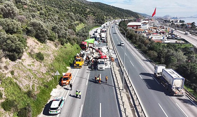 TEM Otoyolu'nun Kocaeli geçişinde lastiği patlayan ve sağ şeritte duran TIR'a, arkadan gelen TIR çarpıp devrildi. Kazada devrilen TIR'ın sürücü yaralandı, otoyolun İstanbul yönü trafiğe kapandı.Kaza, saat 13.00 sıralarında, TEM Otoyolu'nun Körfez ilçesi geçişi Şirinaylı mevkisinde meydana geldi. İstanbul yönüne seyreden sürücüsünün ismi öğrenilemeyen 41 ASF 137 plakalı konteyner yüklü TIR'ın lastiği patladı. TIR'ın sürücüsü aracını sağ şeritte durdurdu. Bu sırada arkadan gelen 42 BES 996 plakalı mukavva yüklü TIR, park halindeki TIR'a çarpıp devrildi. Devrilen TIR'ın sürücüsü yaralandı. Çevredekilerin 112 Acil Çağrı Merkezi'ne ihbarı üzerine bölgeye itfaiye, sağlık, jandarma ve Karayolları ekipleri sevk edildi. Sağlık ekibinin ilk müdahalesinin ardından yaralı hastaneye kaldırıldı.Kaza nedeniyle 3 şeritli otoyolun İstanbul yönü trafiğe kapandı. Kilometrelerce araç kuyruğu oluşu. Ekiplerin, yaklaşık 2 saattir yola saçılan malzemeleri temizleme çalışmaları sürüyor. Öte yandan, kaza nedeniyle oluşan trafik yoğunluğu dronla görüntülendi.