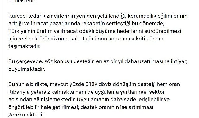 TÜRKİYE Odalar ve Borsalar Birliği (TOBB) Başkanı Rifat Hisarcıklıoğlu, "Merkez Bankası'nın döviz dönüşüm desteği uygulaması 30 Nisan'da sona ermektedir. Söz konusu desteğin en az bir yıl daha uzatılmasına ihtiyaç duyulmaktadır" dedi.TOBB Başkanı Hisarcıklıoğlu, sanal medya hesabından yaptığı açıklamada, Türkiye Cumhuriyet Merkez Bankası'nın döviz dönüşüm desteği uygulamasının 30 Nisan'da sona ereceğini belirterek, "Küresel tedarik zincirlerinin yeniden şekillendiği, korumacılık eğilimlerinin arttığı ve ihracat pazarlarında rekabetin sertleştiği bu dönemde, Türkiye'nin üretim ve ihracat odaklı büyüme hedeflerini sürdürebilmesi için reel sektörümüzün rekabet gücünün korunması kritik önem taşımaktadır. Bu çerçevede, söz konusu desteğin en az bir yıl daha uzatılmasına ihtiyaç duyulmaktadır. Bununla birlikte, mevcut yüzde 3'lük döviz dönüşüm desteği hem oran itibarıyla yetersiz kalmakta hem de uygulama şartları reel sektör açısından ağır işlemektedir. Uygulamanın daha sade, erişilebilir ve öngörülebilir hale getirilmesi; destek oranının ise artırılması gerekmektedir. Bu yönde atılacak adımlar, sanayicilerimize ve ihracatçılarımıza moral verecek, firmalarımızın finansman koşullarını destekleyecek ve ihracat hacmimize olumlu katkı sağlayacaktır" ifadelerini kullandı.