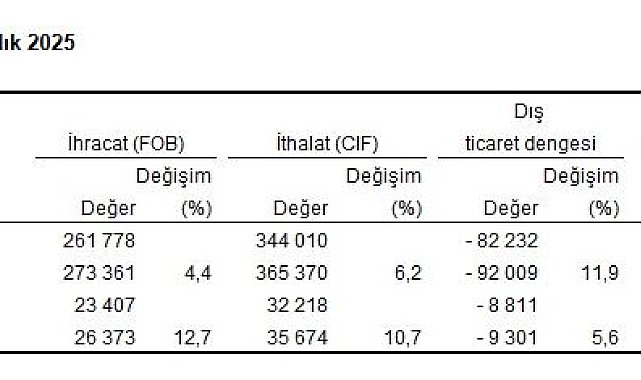 ANKARA, (DHA)- TÜRKİYE İstatistik Kurumu (TÜİK), 2025 yılında ihracatın bir önceki yıla göre yüzde 4,4 artarak 273 milyar 361 milyon dolar, ithalatın yüzde 6,2 artarak 365 milyar 370 milyon dolar olarak gerçekleştiğini açıkladı