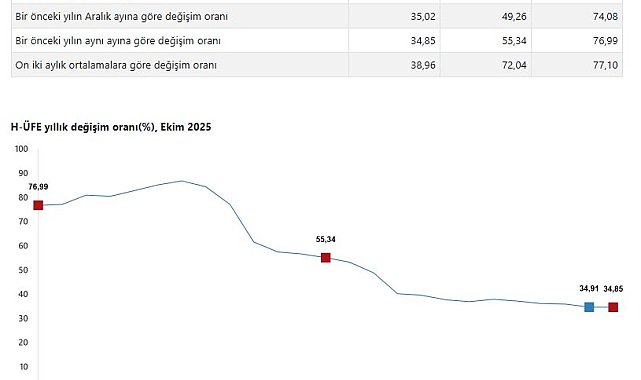TÜRKİYE İstatistik Kurumu (TÜİK), hizmet üretici fiyatlarının ekim ayında yıllık yüzde 34,85; aylık yüzde 0,19 arttığını açıkladı.TÜİK, Ekim 2025 dönemine ilişkin hizmet üretici fiyat endeksi verilerini açıkladı. Buna göre, hizmet üretici fiyatları, ekim ayında bir önceki aya göre yüzde 0,19, bir önceki yılın aralık ayına göre yüzde 35,02, bir önceki yılın aynı ayına göre yüzde 34,85 ve 12 aylık ortalamalara göre yüzde 38,96 arttı.Bir önceki yılın aynı ayına göre, ulaştırma ve depolama hizmetlerinde yüzde 30,92 artış, konaklama ve yiyecek hizmetlerinde yüzde 35,53 artış, bilgi ve iletişim hizmetlerinde yüzde 35,64 artış, gayrimenkul hizmetlerinde yüzde 47,11 artış, mesleki, bilimsel ve teknik hizmetlerde yüzde 39,51 artış, idari ve destek hizmetlerde yüzde 38,01 artış gerçekleşti. Bir önceki aya göre, ulaştırma ve depolama hizmetlerinde yüzde 0,91 artış, konaklama ve yiyecek hizmetlerinde yüzde 2,03 azalış, bilgi ve iletişim hizmetlerinde yüzde 2,16 artış, gayrimenkul hizmetlerinde yüzde 1,52 artış, mesleki, bilimsel ve teknik hizmetlerde yüzde 1,78 artış, idari ve destek hizmetlerde yüzde 2,18 azalış gerçekleşti.
