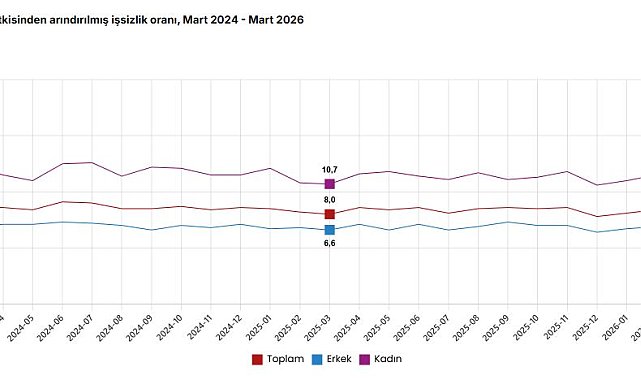 TÜRKİYE İstatistik Kurumu (TÜİK), mart ayında işsizlik oranının yüzde 0,3 puan azalarak yüzde 8,1 seviyesinde gerçekleştiğini açıkladı. TÜİK, Mart 2026 dönemine ilişkin iş gücü istatistiklerini açıkladı. Buna göre; 15 ve daha yukarı yaştaki kişilerde işsiz sayısı 2026 yılı Mart ayında bir önceki aya göre 96 bin kişi azalarak 2 milyon 873 bin kişi oldu. İşsizlik oranı ise 0,3 puan azalarak yüzde 8,1 seviyesinde gerçekleşti. İşsizlik oranı erkeklerde yüzde 6,8 iken kadınlarda yüzde 10,7 olarak kaydedildi. İstihdam edilenlerin sayısı 2026 yılı Mart ayında bir önceki aya göre 226 bin kişi artarak 32 milyon 425 bin kişi, istihdam oranı ise 0,3 puan artarak yüzde 48,5 oldu. Bu oran erkeklerde yüzde 66 iken kadınlarda yüzde 31,5 olarak gerçekleşti. İş gücü, 2026 yılı Mart ayında bir önceki aya göre 129 bin kişi artarak 35 milyon 298 bin kişi, iş gücüne katılma oranı da 0,1 puan artarak yüzde 52,8 olarak gerçekleşti. İş gücüne katılma oranı erkeklerde yüzde 70,8 iken kadınlarda yüzde 35,3 oldu.GENÇ NÜFUSTA İŞSİZLİK ORANI YÜZDE 15,3 15-24 yaş grubunu kapsayan genç nüfusta işsizlik oranı bir önceki aya göre 0,5 puan azalarak yüzde 15,3 oldu. Bu yaş grubunda işsizlik oranı; erkeklerde yüzde 12,8, kadınlarda ise yüzde 20,4 kaydedildi.İstihdam edilenlerden referans döneminde işbaşında olanların, mevsim ve takvim etkilerinden arındırılmış haftalık ortalama fiili çalışma süresi 2026 yılı Mart ayında bir önceki aya göre 0,8 saat azalarak 41,7 saat olarak gerçekleşti. Zamana bağlı eksik istihdam, potansiyel iş gücü ve işsizlerden oluşan atıl iş gücü oranı 2026 yılı Mart ayında bir önceki aya göre 1,6 puan artarak yüzde 31,5 oldu. Zamana bağlı eksik istihdam ve işsizlerin bütünleşik oranı yüzde 21 iken işsiz ve potansiyel iş gücünün bütünleşik oranı yüzde 20,4 olarak gerçekleşti.