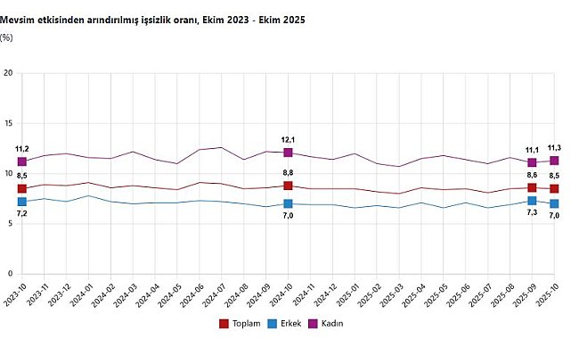 TÜRKİYE İstatistik Kurumu (TÜİK), ekim ayında işsizlik oranının bir önceki aya göre 0,1 puan azalarak yüzde 8,5 seviyesinde gerçekleştiğini açıkladı. TÜİK, Ekim 2025 dönemine ilişkin iş gücü istatistiklerini açıkladı. Buna göre; 15 ve daha yukarı yaştaki kişilerde işsiz sayısı 2025 yılı Ekim ayında bir önceki aya göre 27 bin kişi azalarak 3 milyon 33 bin kişi oldu. İşsizlik oranı 0,1 puan azalarak yüzde 8,5 seviyesinde gerçekleşti. İşsizlik oranı erkeklerde yüzde 7 iken kadınlarda yüzde 11,3 kaydedildi. İstihdam edilenlerin sayısı 2025 yılı Ekim ayında bir önceki aya göre 185 bin kişi artarak 32 milyon 772 bin kişi, istihdam oranı 0,2 puan artarak yüzde 49,2 oldu. Bu oran erkeklerde yüzde 66,5 iken kadınlarda yüzde 32,4 olarak gerçekleşti. İş gücü, 2025 yılı Ekim ayında bir önceki aya göre 157 bin kişi artarak 35 milyon 804 bin kişi, iş gücüne katılma oranı ise 0,2 puan artarak yüzde 53,8 olarak gerçekleşti. İş gücüne katılma oranı erkeklerde yüzde 71,5 iken kadınlarda yüzde 36,5 oldu.GENÇ NÜFUSTA İŞSİZLİK ORANI YÜZDE 15,6 15-24 yaş grubunu kapsayan genç nüfusta işsizlik oranı bir önceki aya göre 0,6 puan artarak yüzde 15,6 oldu. Bu yaş grubunda işsizlik oranı; erkeklerde yüzde 12,9, kadınlarda yüzde 20,6 olarak gerçekleşti. İstihdam edilenlerden referans döneminde işbaşında olanların, mevsim ve takvim etkilerinden arındırılmış haftalık ortalama fiili çalışma süresi 2025 yılı Ekim ayında bir önceki aya göre 0,7 saat azalarak 42,2 saat olarak gerçekleşti. Zamana bağlı eksik istihdam, potansiyel iş gücü ve işsizlerden oluşan atıl iş gücü oranı 2025 yılı Ekim ayında bir önceki aya göre 1,1 puan artarak yüzde 29,6 oldu. Zamana bağlı eksik istihdam ve işsizlerin bütünleşik oranı yüzde 20 iken işsiz ve potansiyel iş gücünün bütünleşik oranı yüzde 19,5 kaydedildi.