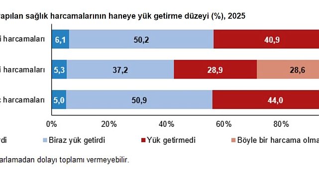TÜRKİYE İstatistik Kurumu (TÜİK), doktor muayene ve tedavi harcamalarının hanelerin yüzde 6,1'ine çok yük getirdiğini, yüzde 50,2'sine biraz yük getirdiğini, yüzde 40,9'una ise yük getirmediğini açıkladı.TÜİK, 2025 yılına ilişkin 'Sağlık Modülü' verilerini yayımladı. Buna göre, 'Sağlık Modülü' adlı çalışma, 2025 yılında Gelir ve Yaşam Koşulları Araştırması ile birlikte modül olarak uygulandı. Avrupa Birliği ülkeleri ile aynı dönemde uygulanan modülün amacı, hanelerdeki 15 yaş ve üstündeki tüm fertlerin sağlık durumlarını ve bu alandaki harcamalarının hane halkına getirdiği yükü tespit etmek olarak belirlendi.TEDAVİ HARCAMALARI HANELERİN YÜZDE 6,1'İNE ÇOK YÜK GETİRDİAraştırma sonuçlarında; doktor muayene ve tedavi harcamalarının hanelerin yüzde 6,1'ine çok yük getirdiği, yüzde 50,2'sine biraz yük getirdiği, yüzde 40,9'una ise yük getirmediği görüldü. Diş muayene ve tedavi harcamaları ise hanelerin yüzde 5,3'üne çok, yüzde 37,2'sine biraz yük getirirken, yüzde 28,9'una yük getirmedi. İlaç harcamaları ise hanelerin yüzde 5'ine çok, yüzde 50,9'una biraz yük getirdi. Ayrıca hanelerin yüzde 44'ü ilaç harcamalarının yük getirmediğini belirtti. Son 12 ay içinde hanelerin yüzde 2,7'si muayene veya tedavi, yüzde 28,6'sı diş muayenesi veya tedavisi, yüzde 0,1'i ise ilaç harcaması yapmadı.Doktor muayene ve tedavi ile ilaç için harcama yapmayan hanelerin gelir gruplarından çok etkilenmediği görüldü. Diş muayene ve tedavisine ilk (en düşük) yüzde 20'lik gelir grubunda olanların yüzde 45,4'ünün, ikinci yüzde 20'lik gelir grubunun yüzde 36,5'inin, üçüncü yüzde 20'lik gelir grubunun yüzde 32'sinin, dördüncü yüzde 20'lik gelir grubunun yüzde 28,1'inin, beşinci (en yüksek) gelir grubunun ise yüzde 25,5'inin harcama yapmadığı görüldü.En düşük yüzde 20'lik gelir grubundaki hanelerin yüzde 62,9'una doktor muayene ve tedavileri, yüzde 37,6'sına diş muayene ve tedavileri, yüzde 65,5'ine ise ilaç harcamaları yük getirdi. En yüksek yüzde 20'lik gelir grubundaki hanelerin yüzde 53'ü doktor muayene ve tedavilerinin, yüzde 38'i diş muayene ve tedavilerinin, yüzde 59,5'i ilaç harcamalarının yük getirmediğini belirtti.YOKSULLUK RİSKİ ALTINDA OLMAYANLARIN YÜZDE 31,7'Sİ OTURARAK ÇALIŞANLARBir işte çalışan 15 yaş ve üstü fertlerin tüm çalıştıkları süredeki aktivite yoğunlukları incelendiğinde, çoğunlukla bu fertlerin yüzde 29,4'ünün oturarak, yüzde 45,5'inin ayakta durarak, yüzde 18,7'sinin yürüyerek veya orta düzey fiziksel aktivite yaparak, yüzde 6,4'ünün ise ağır iş ya da ağır fiziksel aktivite yaparak çalıştığı görüldü. Yoksulluk veya sosyal dışlanma riski altında olan fertlerin yüzde 17,2'si oturarak çalışırken risk altında olmayan fertler için bu oran yüzde 31,7 oldu. Yoksulluk veya sosyal dışlanma riski altında olan fertlerin yüzde 11,2'sinin ağır iş ya da aktivite yaparak çalışma hayatını geçirdiği görüldü.FİZİKSEL AKTİVİTEYE ZAMAN AYIRMAYANLARIN ORANI YÜZDE 63,3 OLDUBir işte çalışsın ya da çalışmasın 15 yaş ve üstü fertlerin olağan bir haftada iş dışında geçirilen zamanları incelendiğinde, bu fertlerin yüzde 1,4'ünün 'Günde iki kere veya daha fazla', yüzde 11,6'sının 'Günde bir kere', yüzde 5,6'sının 'Haftada 4-6 kere', yüzde 11,5'inin 'Haftada 1-3 kere', yüzde 6,7'sinin 'Haftada 1 kereden az' en az 10 dakika boyunca aralıksız devam eden fiziksel aktivite veya boş zaman faaliyetleri yaptıkları tespit edildi. Fertlerin yüzde 63,3'ünün ise fiziksel aktivite veya boş zaman faaliyetlerine zaman ayırmadığı görüldü.FERTLERİN YÜZDE 96,9'U İLETİŞİM FAALİYETLERİNDE ZORLANMIYORAraştırma kapsamındaki 15 yaş ve üstü fertlerin yüzde 96,9'u iletişim kurmada, yüzde 95,8'i öz bakımında, yüzde 90'ı işitmede, yüzde 85,2'si bir şeyleri hatırlamada, yüzde 80,5'i görmede ve yüzde 79,7'si yürümede sorun yaşamadığını ifade etti. En çok zorlanılan faaliyetler ise sırası ile yüzde 17,3 ile görme, yüzde 15,2 ile yürüme, yüzde 12,6 ile hatırlama olurken fertlerin sadece yüzde 2,2'si iletişim faaliyetlerinde zorlandığını söyledi. Fertlerin en çok yapamadığını belirttiği faaliyetler ise yüzde 0,5 ile öz bakım, yüzde 0,4 ile yürüme, yüzde 0,2 ile bir şeyleri hatırlama ve iletişim kurma faaliyetleri oldu.