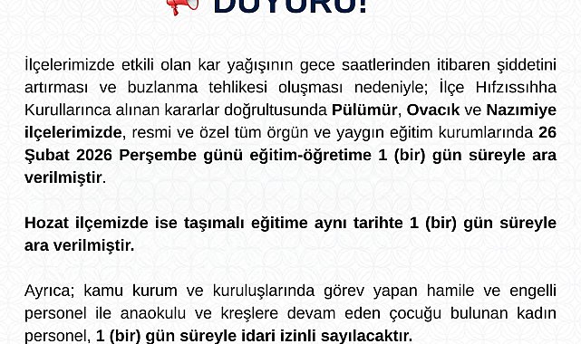 TUNCELİ Valiliği, kar yağışı ve buzlanma tehlikesi nedeniyle Pülümür, Ovacık ve Nazımiye ilçelerinde tüm okullarda, Hozat ilçesinde de taşımalı eğitim yapan okullarda bugün eğitime ara verildiğini duyurdu.Tunceli Valiliği'nden yapılan açıklamada, etkisini artıran kar yağışı ve buzlanma tehlikesi nedeniyle Pülümür, Ovacık ve Nazımiye ilçelerinde tüm okullarda, Hozat ilçesinde de taşımalı eğitim yapan okullarda eğitime bugün eğitime ara verildiğini duyurdu. Valilik açıklamasında, "İlçelerimizde etkili olan kar yağışının gece saatlerinden itibaren şiddetini artırması ve buzlanma tehlikesi oluşması nedeniyle; İlçe Hıfzıssıhha Kurullarınca alınan kararlar doğrultusunda Pülümür, Ovacık ve Nazımiye ilçelerimizde, resmi ve özel tüm örgün ve yaygın eğitim kurumlarında 26 Şubat 2026 Perşembe günü eğitim-öğretime 1 (bir) gün süreyle ara verilmiştir. Hozat ilçemizde ise taşımalı eğitime aynı tarihte 1 (bir) gün süreyle ara verilmiştir. Ayrıca; kamu kurum ve kuruluşlarında görev yapan hamile ve engelli personel ile anaokulu ve kreşlere devam eden çocuğu bulunan kadın personel, 1 (bir) gün süreyle idari izinli sayılacaktır" denildi.