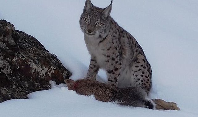 ERZİNCAN'da nesli tükenme tehlikesi altında bulunan vaşak avlanırken görüntülendi. Refahiye ilçesi Kırkbulak köyünde doğa fotoğrafları çeken Berfin Karataş, avladığı tavşanı yiyen bir vaşak fark etti. Bir süre avının başında bekleyen vaşak, daha sonra ağzına aldığı tavşanla uzaklaştı. O anları kayıt altına alan Karataş'ın sanal medya hesabından paylaştığı görüntüler, kısa sürede çok sayıda izlendi.