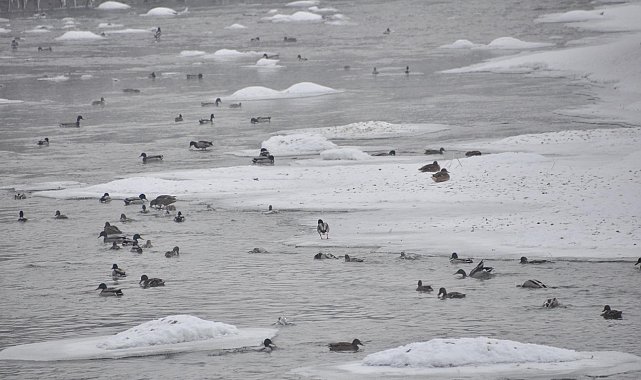 KARS Çayı'nın yüzeyi, etkili olan soğuklar nedeniyle büyük oranda buz tuttu. Donmayan küçük alanlar ise yeşilbaş ördeklerin yaşam alanı oldu. Doğu Anadolu Bölgesi'nde etkili olan soğuklar, yaban hayatını da olumsuz etkiledi. Termometrelerin gece eksi 25 dereceye kadar düştüğü Kars'ta, kentin içinden geçen Kars Çayı'nın yüzeyinin büyük bölümü buz tuttu. Akıntının etkisiyle donmayan küçük alanlar ise yaban ördeklerinin yaşam alanı oldu.Yaban ördekleri, bir yandan dondurucu soğuğa karşı direnirken bir yandan da akıntı içindeki sığ alanlarda yiyecek arayışını sürdürüyor. Rahatsız edilmeden doğal ortamlarında hayatlarını idame ettiren ördeklerin su üzerindeki o anları kaydedildi.Buz kütlelerinin arasında toplu halde yüzen ördekler, beyaz örtüyle kaplı doğada güzel görüntüler oluşturdu.